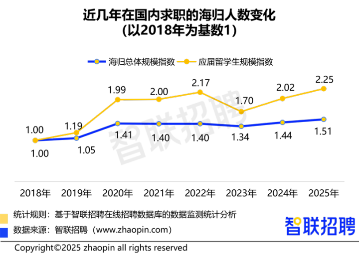 智联招聘平台数据显示,2025年,在国内求职的海归人数较2024年增长5%,达到2018年的1.51倍;其中,回国求职的应届留学生人数较2024年增长12%,达到2018年的2.25倍,创下近八年来新高。