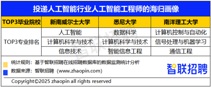 智联招聘平台数据显示,84%的海归投递者具有硕士学位,38%为2025届应届留学生。毕业院校高度集中于全球顶尖理工科强校,如新南威尔士大学、悉尼大学、南洋理工大学等,其专业背景多为人工智能、计算机科学、数据科学、通信工程等相关方向。